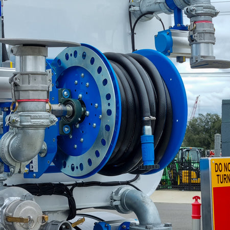 Heavy duty high volume manual rewind hose reel fitted with 20m of 25mm industrial wash down hose and adjustable fire fighting nozzle.